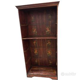 libreria in legno sheesham color ciliegio conquista con il suo stile artistico e originale. I quattro ripiani, tutti rimovibili, eccetto quello centrale, offrono grande versatilità, mentre i delicati disegni floreali dipinti a mano aggiungono un tocco di colore e personalità. Piccoli difetti visibili in foto non compromettono l’uso, ma ne esaltano l’unicità, rendendo ogni dettaglio ancora più affascinante.