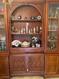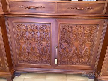 Libreria in stile 600 Senese, in noce di mansonia massello, lavorata e scolpita a mano, scomponibile in 3 parti , larghezza di 5.30mt. prof.65cm altezza 2.70mt ,con vetri da 3 mm scolpiti e decorati in oro 24 carati , N 8 vetri, chiavi porte in bronzo. contattare per info