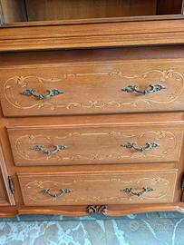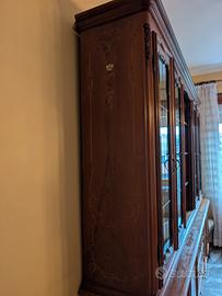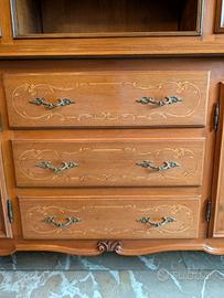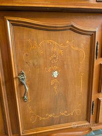 Libreria in stile in noce intarsiata con motivi floreali. composta da 2 pezzi separabili. Il lato superiore costituito da 2 vetrine con mensole centrale. Parte inferiore con cassettiera centrale e 2 scomparti a 2 ante. Prodotto di falegnameria artigianale. Pezzo unico. Prezzo trattabile. Possibile trasporto a parte.