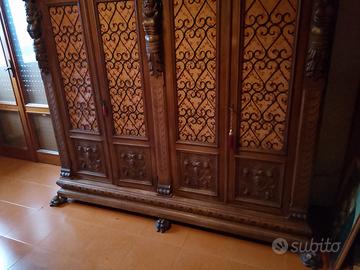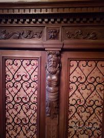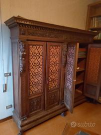Libreria in stile Rinascimentale fine '800 inizi '900 in legno massello intarsiato e lavorato a mano, ottime condizioni misure 230x50x200 con due Moduli laterali