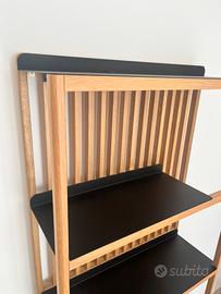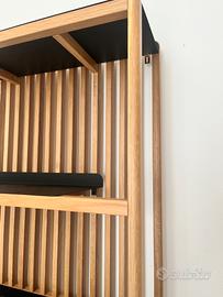 Libreria in stile scandinavo e industriale con doghe in rovere massello e piano in lamiera d’acciaio nero.