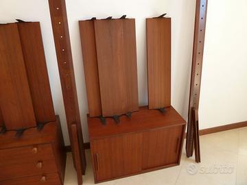 Libreria bifacciale cielo terra in teak anni 60 due campate, otto scaffali 80x22, un vano a cassettiera ed uno ad ante scorrevoli con ripiano interno (80x35x60), con serramenti e piedini regolabili in ottone e montanti in teak pieno regolabili in altezza( minima 2,90 metri ). Smontata, solo ritiro sul posto