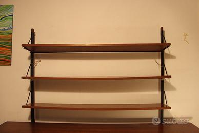 Libreria anni ’50/’60 con struttura in legno teck e montanti in metallo.