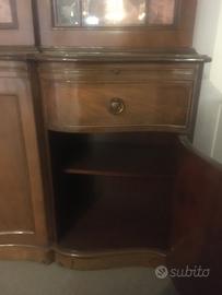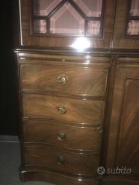 Libreria stile inglese in mogano con vetrina centrale con 6 ripiani foderata internamente, alla base 2 cassetti 2 ante fatte a cassetto e due ante centrali