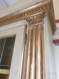 LIbreria anni 50 laccata . Il mobile dispone di grandi spazi per libri o altro dotato di vari ripiani sia sulla parte bassa che sulla vetrina . Dispone inoltre di una piccola cassettiera . La libreria presenta alcune piccole scoriature e segni sul rivestimento interno dovute al tempo . Le ante sono dotate di serratura . Da evidenziare le sculture dorate poste alle estremita del mobile . Ovviamente la libreria si compone di due parti seperate sovrapponibili . Non ci sono tarli o parrticolari difetti da evodenziare . Da notare i vetri antichizzati rilegati a piombo . Tutta la libreria è foderata di un tessuto giallo . Possibile il trasporto se entro una certa distanza ( 70 km da Sanfront ) . Dimensione : 249 x 46 x 230 h.