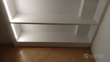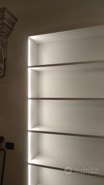 libreria costruita in listellare di mdf (idoneo per la laccatura uniforme) in NICCHIA con misure lungh.131 circa prof. 22 h 245 predisposto con fianco angolare a L per rientrare dalla sporgenza che c'è nel muro, costruito con fianchi dritti lisci da 3 cm come pure i ripiani e saranno 5 ripiani aggiustabili con ferramenta adatta a coda di rondine e bussola avvitata nel legno, completo di schienale posteriore da 8 mm e scavo laterale sx per inserire barra led con relativo trasformatore, tutto a giorno e gambette livellatrici nascoste dietro lo zoccolo con perni giunzioni in ferro e spine n legno. Completo di finitura LACCATA rall da decidere o 9010 bianco opaco. Il prezzo si intende compreso finitura led esclusa iva, costruito su commissione ed esigenze del cliente, non è disponibile a magazzino ma essendo i diretti produttori falegnami possiamo riprodurlo uguale o in base alle proprie esigenze. per domande o dubbi contattateci P.S. disponibili a dare suggerimenti o chiarimenti in merito, per noi conta dare vita al vostro sogno DIRETTAMENTE DAL PRODUTTORE ASTENERSI RIVENDITORI O COMMERCIANTI