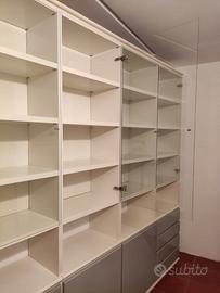 Per cambio abitazione vendo a malincuore grande libreria di ottima fattura, molto robusta, con 4 ante vetrate. Laccata bianca opaca nella struttura e grigio lucido nelle ante e cassetti. Piccoli segni del tempo come in foto. Misure 35x243 cm, altezza 234 cm.