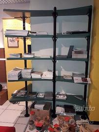 Libreria laccata verde composta da 4 piantane nere in ferro e 15 ripiani sagomati/stondati di diverse misure. Componibile ad angolo o in linea.