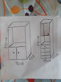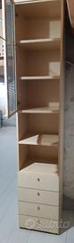 Libreria composta da due parti, si possono montare anche separate. Finitura tipo abete. Misure della colonna: h 230cm, l 45cm, p 43cm. Misure della libreria: h 230cm, l 90cm, p 43cm.