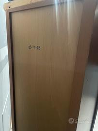 Libreria composta da quattro piani di cui uno chiuso con anta. Alta 160,5 cm, larga alla base (parte piu larga)64 cm, profonda alla base (parte piu larga)39 cm. Il mobile si presenta in ottime condizioni, di ottima qualitá e robustezza. Unico difetto la piantana e scollata nell’angolo come da foto. Perfetto per amanti di restauro.