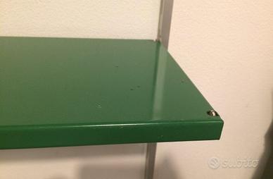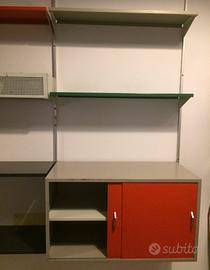 Libreria metallo da muro. Colorata. Mensole, un mobiletto con ante scorrevoli e fioriera