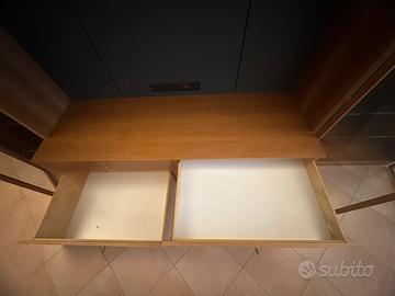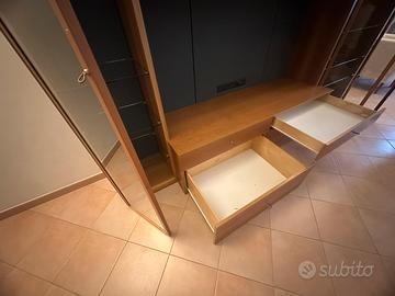 Libreria in essenza noce naturale, boiserie finitura goffrata blu, ante in vetro trasparente, attacchi TV. Prodotto Tisettanta.