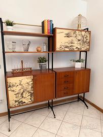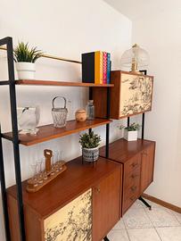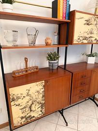 Libreria Modulare Mid-Century in Teak e Metallo – Produzione Italiana Anni ‘50/‘60 Elegante parete attrezzata modulare di produzione italiana originale degli anni ‘50 o ‘60. Il design richiama lo stile scandinavo. Struttura portante in metallo laccato nero con raffinati piedini regolabili in ottone. I vani e i ripiani sono realizzati in legno impiallacciato teak. ante litografate decorate con scene di gusto orientale, un dettaglio distintivo che rende il mobile un pezzo d’arte oltre che funzionale. 2 ampi vani contenitori con ante battenti. 1 vano superiore a ribalta (ideale come mobile bar). Una cassettiera integrata con 4 cassetti. Ripiani a giorno regolabili in altezza. Misure: L171 H181 P40 Prezzo 600€‼️ Possibilità di spedizione 📦 Ritiro in sede Lugo (Ra)