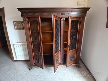 Libreria con ante in vetro e decorazioni in ferro battuto. Una antina è leggermente danneggiata all'interno, in posizione non visibile. Larghezza cm 187,5 - Profondità cm 55 - Altezza cm 190,5