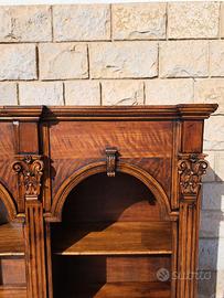 Vendo Libreria con 2 archi in legno Massello, Credenza con vani a giorno e 6 ripiani. Elegante libreria in stile classico di una bella tonalità di legno di colore noce chiaro si abbina perfettamente a tutti gli stili, dal classico al moderno. Mobile di grande qualità riccamente intagliato e decorato con motivi floreali. Credenza di forma lineare in ottime condizioni perché completamente restaurata. Il mobile è molto spazioso, con dei ripiani grandi per riporre qualsiasi oggetto o grandi faldoni per uno Studio Professionale. La libreria puo essere collocato in qualsiasi punto della casa dal soggiorno all'ingresso o in uno studio. L. 140 P. 43 H. 153.