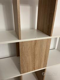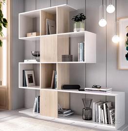 Bellissima libreria in stile moderno con struttura in bianco opaco e inserti in legno chiaro effetto rovere.