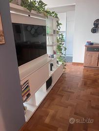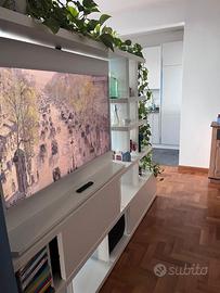 Libreria Mobile TV in legno laccato bianco double face (la parte tv gira a 180 gradi) per dividere in due ambienti e creare separazione tra gli spazi. Sistema brevettato con cavi invisibli. Ante scorrevoli alla base . Condizioni perfette. Lungo 235 cm Alto 170 cm Profondo 40. Prezzo nuovo 4,200 euro. Poiché é in legno (no laminato/truciolato) puó essere facilmente adattato a dimensioni diverse.