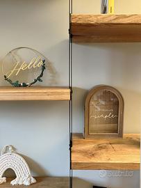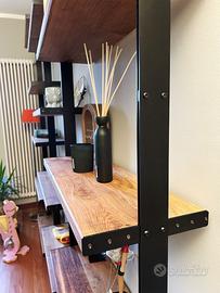 Tra i montanti trovano spazio i ripiani in rovere massello, accuratamente spazzolati per esaltare la naturale matericità del legno e rifiniti ad olio per mantenerne il colore autentico. Su richiesta, è disponibile anche una variante shabby black, per ambienti dal carattere più deciso.