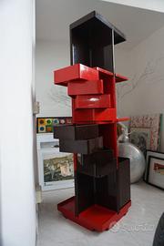 Libreria di design modulare min plastica ABS, colori marrone scuro e rosso brillante.