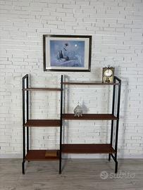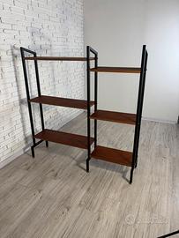 Libreria modulare doppia di modernariato italiano, anni ’60, con struttura in metallo verniciato e ripiani in teak.