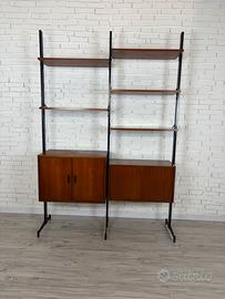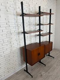 Libreria modulare doppia in teak con montanti in metallo laccato nero, produzione italiana modernista anni ’60.