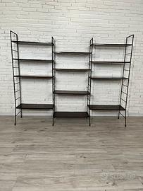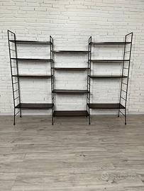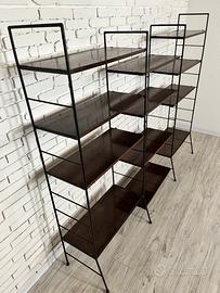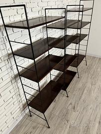 Elegante libreria a giorno in metallo verniciato nero con ripiani in legno noce.