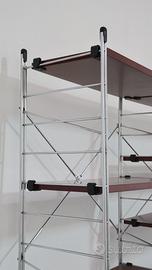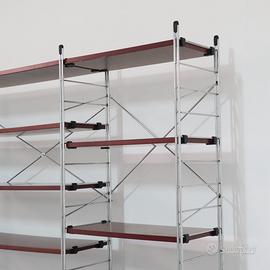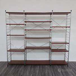 Elegante libreria modulare in stile String System, realizzata negli anni ’80. La struttura è composta da montanti in metallo cromato con intrecci posteriori a croce e mensole in legno impiallacciato color mogano, regolabili in altezza.