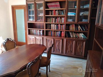 Libreria - studio in Mogano, due lati ad elle: lunghezza 775 (400 + 375), altezza 330, profondità 60cm, 4 vetrinette a doppia anta sotto chiave.