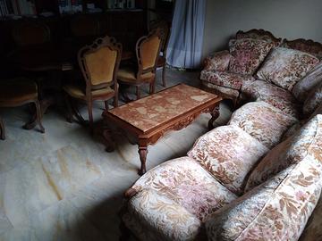 Divano 7 posti in velluto damascato con tavolino in marmo Carrara.