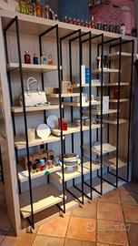 2 librerie laccate con traverse in ferro e retro in tessuto adatto per casa o arredamento negozio