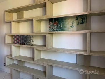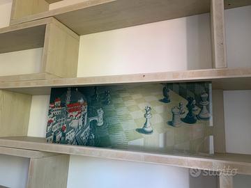 libreria fatta da artigiano con 2 vetrinette che si spostano con dettaglio Escher.