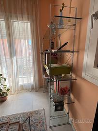 Libreria in acciaio e vetro. Altezza totale cm 180, mensole in vetro lunghezza cm 130, profondità cm 32.