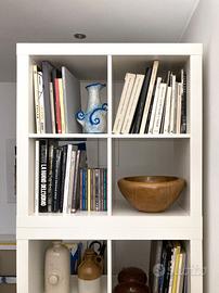 Libreria a scaffali tipo Kallax, bianco. Costituita da due elementi, ciascuno largo 79 cm e profondo 39 cm, uno alto 149 cm e l'altro 79 cm. Altezza totale se disposti uno sull'altro come nella foto 228 cm. Possono essere utilizzati insieme o separatamente. Come si vede nelle foto, non ha un fondo posteriore e può essere usata come separazione in uno stesso ambiente con un risultato molto gradevole perché lascia passare la luce.