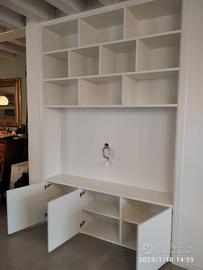 Libreria porta tv libri e oggetti costruito in listellare ricoperto di mdf (idoneo per essere laccato uniformemente liscio paco) con misura lunghezza 183 h 270 prof. 42 con fasce di tamponamento ai lati e nella parte superiore disposto nella parte bassa troveremo 3 ante che si apriranno su cerniere regolabili con apertura push pull a pressione, con h circa 60 con all'interno disposto ripiano aggiustabile in altezza con ferramenta idonea, schienale da 8 mm, parte centrale tv con fianchi verticali laterali da 30 cm CON SCHIENALE PORTANTE PER FISSARE LA TV con misura circa 110 x 175. Parte superiore con vani a giorno fisse e sfalsati con ferramenta idonea. Piedini sotto per mettere a bolla il tutto giunzioni invisibili parte centrale a giorno e barilotti con spine in legno per le parti nascoste. Completo di finitura laccata coprente opaco bianco rall 9010. costruito su commissione ed esigenze del cliente, non è disponibile a magazzino ma essendo i diretti produttori falegnami possiamo riprodurlo uguale o in base alle proprie esigenze. per domande o dubbi contattateci P.S. disponibili a dare suggerimenti o chiarimenti in merito, per noi conta dare vita al vostro sogno DIRETTAMENTE DAL PRODUTTORE ASTENERSI RIVENDITORI O COMMERCIANTI