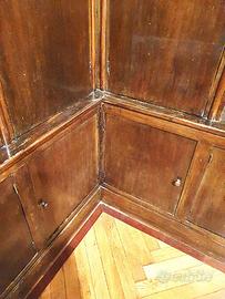 Grande libreria di corrente architettonica razionalismo italiano, anni 40, progetto attribuito all’architetto Gigiotti Zanini. A parete, sviluppo ad angolo, smontabile e riposizionabile. Composta da base contenitiva con sportelli e corpo superiore di scaffalature appoggiate sulla base. Sviluppo continuo ad angolo. Cornice superiore continua. Legno massello con patina originale. Dimensioni: H totale 250 cm. Parete lunga sviluppo totale 330 cm., modulo sx 90 cm., modulo centrale 240 cm., modulo destro 50 cm. Parete corta sviluppo totale 130 cm., modulo sx chiuso 55 cm., modulo dx 75 cm. Profondità base fissa 30 cm., mensole interne corpi chiusi 21 cm. Mensole modulari profondità 18 cm., lunghezza 80 cm., spessore 2 cm., posizionabili su cremagliere laterali. Buone condizioni generali, patina originale con segni del tempo e dell’usura, non restaurata. Possibilità di altre foto, se richieste. Smontaggio, rimozione e trasporto a carico e cura del compratore. Ritiro a Milano, in zona Via Vincenzo Monti, primo piano, circa 30 mt.dall’atrio d’ingresso del palazzo fino all’appartamento. Gradini a salire ed a scendere in atrio ed in cortile.