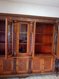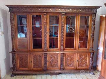 Elegante libreria stile rinascimento con sculture in legno massello intagliato da studio ufficio d'epoca antico