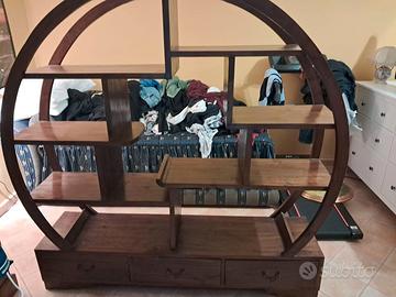 Libreria legno massello tipo teak, tre cassetti, stile moderno. La libreria si trova in ottimo stato, e stata sempre in una camera da letto e poco utilizzata, necessita solo di una sistemata sulla guida del cassetto centrale (la stecchetta di legno è leggermente rovinata e non scorre bene il cassetto). La libreria è larga 40 cm, alta 170 cm (nel punto più alto) e larga 165 cm (nel punto più largo). La libreria è molto bella e si vende per mancato utilizzo.