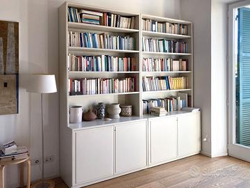 Libreria in legno massello laccato bianco panna. 2 elementi, ciascuno largo 110 cm (larghezza totale 220 cm), altezza 236 cm, profondità della parte aperta a scaffali 28 cm e della parte chiusa con sportelli 43 cm. Lato posteriore chiuso su tutta la superficie. Design, materiali e realizzazione italiana di qualità.
