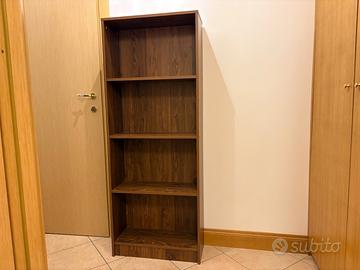 Libreria in legno mdf noce ricevuta in regalo, solo montata, non usata, non si abbina al legno rovere chiaro dell’ambiente circostante.