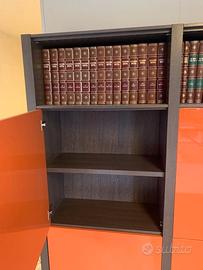 Mobile libreria in rovere grigio, interamente tamburata, con ante laccate color arancio. Dimensioni: L. cm 160 - H. cm 200 - P. cm 38