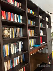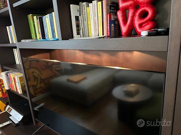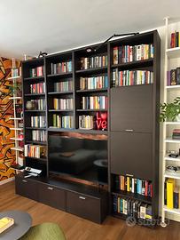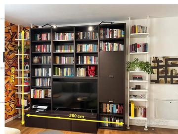 Libreria rovere moro Besana dimensioni 260x262x36 (libreria)x59 (penisola TV) in ottime condizioni. Fondo in rovere moro con uscite scatolate per cavi elettrici e TV. Ampio vano TV (124x86), mostrato in foto TV led da 54”. Il vano è retroilluminato. Dispone di 19 ripiani + 3 cassettoni sotto la penisola TV da 188x59 di dimensione. I cassettoni hanno dimensioni 52x52x26 e come le due ante hanno maniglia di alluminio dal design pulito. Completano la libreria se di interesse due colonne in acciaio verniciato a fuoco bianche con montaggio a compressione (pavimento-soffitto) con 7 ripiani da 40x36x3 regolabili dal valore commerciale di €200 cadauno. Cedo per cambio arredamento.