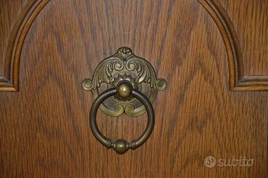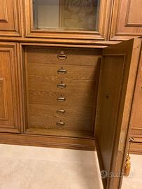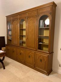 Elegante libreria in rovere, doppio corpo. Corpo superiore cinque ante di cui 3 a giorno con fondo in raso. Anta centrale bassa con cassettiera come da foto. Larghezza cm. 316. Altezza totale cm 270. Profondità corpo basso cm. 47, corpo alto cm. 36. Altezza corpo basso cm. 85. Smontaggio e trasporto a carico acquirente (il mobile si trova al piano terra). Perfette condizioni.