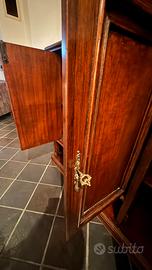 Libreria in rovere, parte inferiore chiusa con cinque ante due centrali che chiudono una zona con due ripiani lunghi ,all’interno, una centrale singola, che chiude una zona sempre con due ripiani ma piu piccoli , due ante laterali che chiudono due zone angolari con due ripiani triangolari. Parte superiore aperta a piu ripiani Ottime condizioni.
