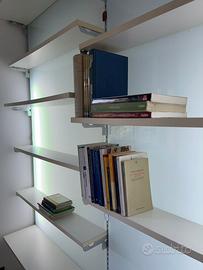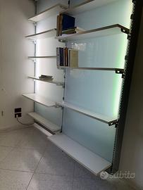 Libreria sospesa a muro da 200x249h in acciaio e vetro satinato antinfortunistico con 14 mensole in legno bianco da 100 con sistema su reggimensola cromato con possibilità di regolazione altezza tra mensole