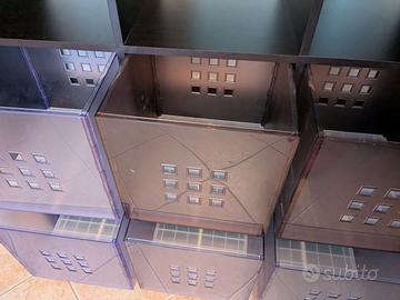 Libreria/scaffale a giorno Ikea, di colore marrone-nero. Viene venduta completa anche dei contenitori di plastica. Questi sono 8, tutti in buono stato, sei sono grigio-bianco e due color ambra-marrone. Pagamento in contanti e ritiro in loco.