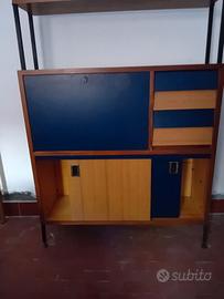 Libreria, scrittoio e contenitore in legno multistrato rivestito. Il mobile è composto da tre parti. In basso due contenitori di cm 45x50 chiusi con due sportelli scorrevoli. Al centro scrittoio con chiusura a ribalta e contenitore interno di cm 42x66, di fianco 4 cassetti cm h32. La parte alta crea una libreria con 3 piani di cm. 35x106.La struttura di sostegno è in acciaio con quadrelli di cm. 2x2. Gli appoggi a terra sono in ottone regolabili in altezza. Altezza massima cm. 193