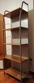 Libreria in ottimo stato, composta da 5 mensole in laminato color ciliegio e con una struttura in metallo color argento; schiena di color argento; piedini posteriori regolabili in altezza. La libreria è smontabile per il trasporto. Ottima occasione per arredare una stanza per ragazzi, per studenti, disbrigo, etc. Le dimensioni sono le seguenti: + Altezza: 192,5 cm + Larghezza: 71 cm + Profondità: 31,5 cm + Mensola: 30 x 68 cm
