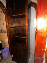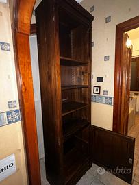 Vendo elegante mobile a colonna in stile classico, realizzato in legno massiccio di alta qualità. Il mobile è robusto e presenta una calda finitura noce scuro, ideale per ingressi, corridoi, studi o salotti. • Struttura: Composta da una parte superiore a giorno con ripiani regolabili in altezza grazie al sistema a cremagliera (scaletta in legno) e una parte inferiore chiusa da uno sportello con serratura funzionante. • Dettagli: Cornice superiore a cappello di gendarme, fianchi rifiniti e sportello bugnato nella parte bassa. Inclusa chiave originale con nappina decorativa (visibile in foto). • Stato: Struttura solida e legno ben conservato. Il sistema a scaletta interna permette di gestire lo spazio in modo versatile per libri o oggettistica. altezza: 229 cm spessore: 37.5 cm larghezza: 65.5 cm No spedizioni, solo ritiro a mano.