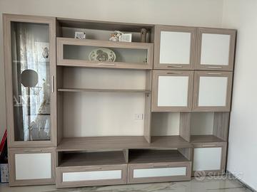 Vendo libreria in ottime condizioni, stile moderno con finitura effetto legno chiaro e inserti bianchi. Composta da vetrinetta laterale con anta in vetro, numerosi vani chiusi e aperti, mensole centrali e spazi ideali per TV o oggetti decorativi.