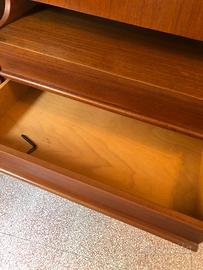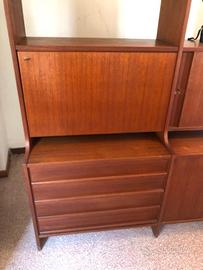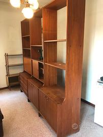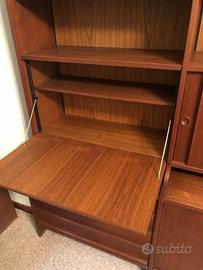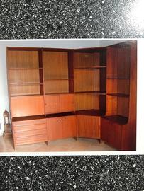 Vendo libreria svedese in tek composta da tre moduli + un angolare con 4 cassetti una ribaltina , due sportelli scorrevoli piu due ante , nell'angolare è presente una serrandina scorrevole, come si vede da una foto è possibile innestare le fodere o tenere a giorno l'intero mobile;